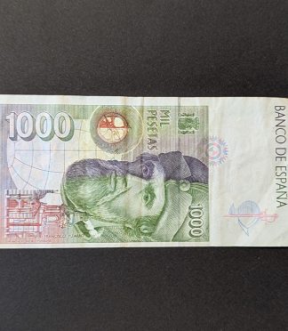 Emisión conmemorativa del V Centenario del Descubrimiento. Billete de 1000 pesetas de 1992 en tonos verdes, dedicado a los conquistadores Hernán Cortés y Francisco Pizarro. Ejemplar circulado pero con buena presencia y color vivo.