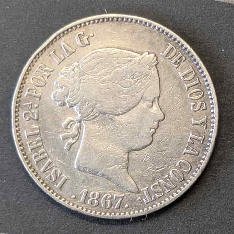 • Anverso: Retrato maduro de la reina Isabel II mirando a la izquierda (busto laureado), con el pelo recogido en un moño elaborado. Leyenda: «ISABEL 2ª POR LA G· DE DIOS Y LA CONST·» (Por la Gracia de Dios y la Constitución) y la fecha 1867.