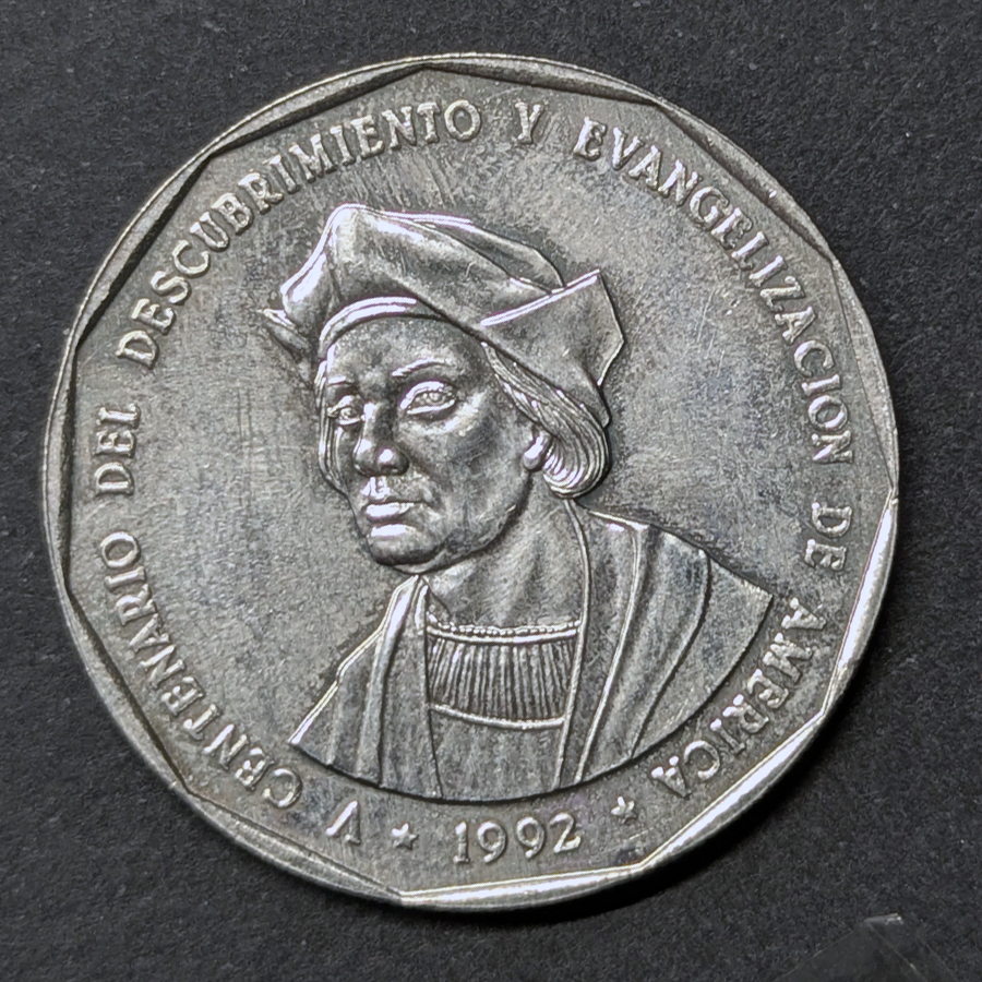 El año 1992 marcó un hito mundial: los 500 años de la llegada de Cristóbal Colón a América. La República Dominicana, tierra donde Colón fundó el primer asentamiento permanente en el Nuevo Mundo, emitió esta moneda especial para celebrar el «V Centenario del Descubrimiento y Evangelización de América».
