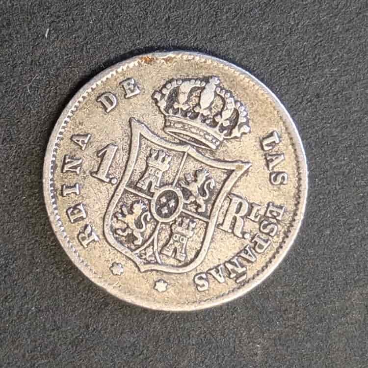 Reverso: Escudo de España coronado. Valor «1 R.» y estrellas de 6 puntas (Madrid).