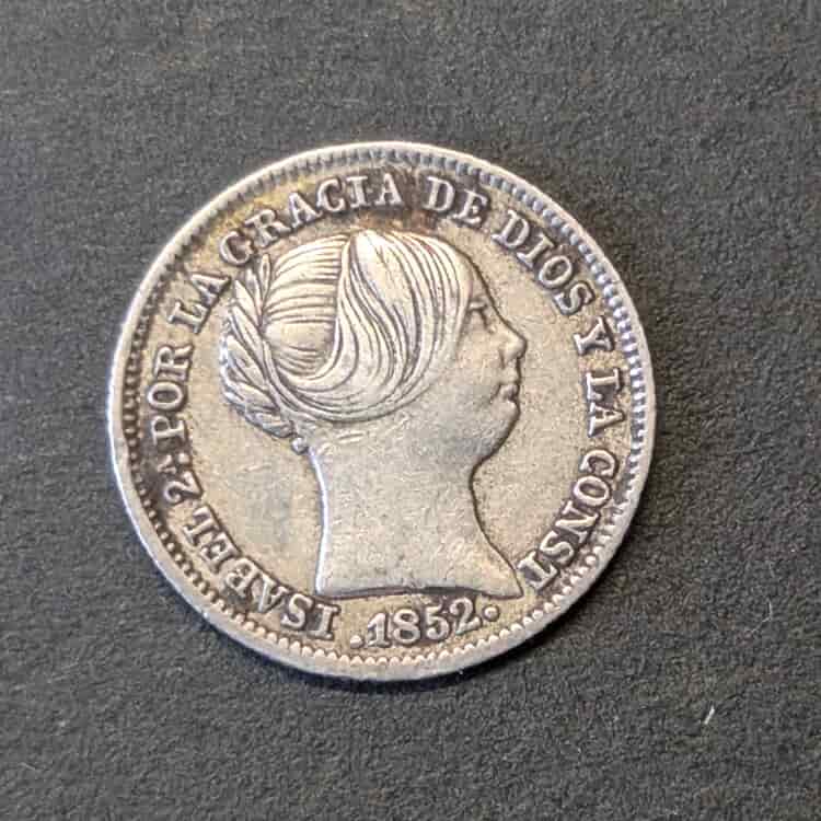 Anverso: Perfil de Isabel II a derecha. Leyenda «ISABEL 2ª POR LA GRACIA DE DIOS Y LA CONST· 1852».