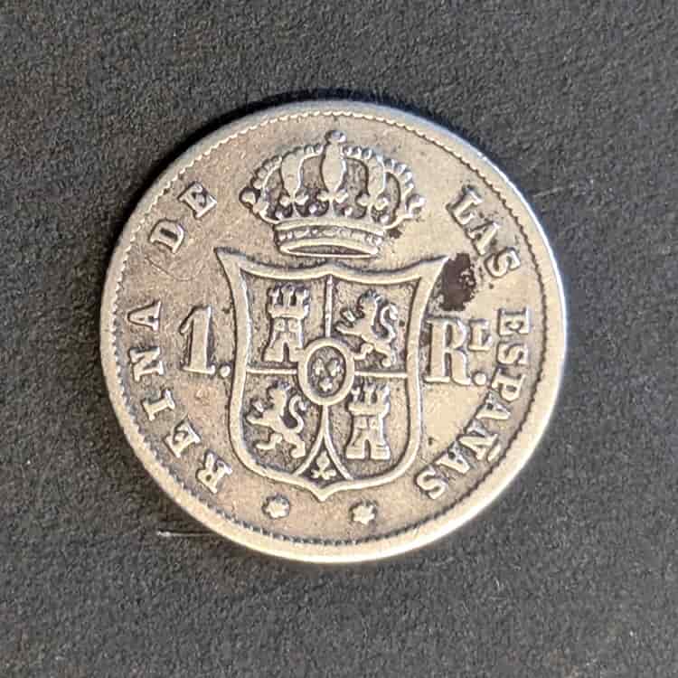 Reverso: Escudo de España coronado, flanqueado por el valor «1 R.» (1 Real). Leyenda «REINA DE LAS ESPAÑAS».