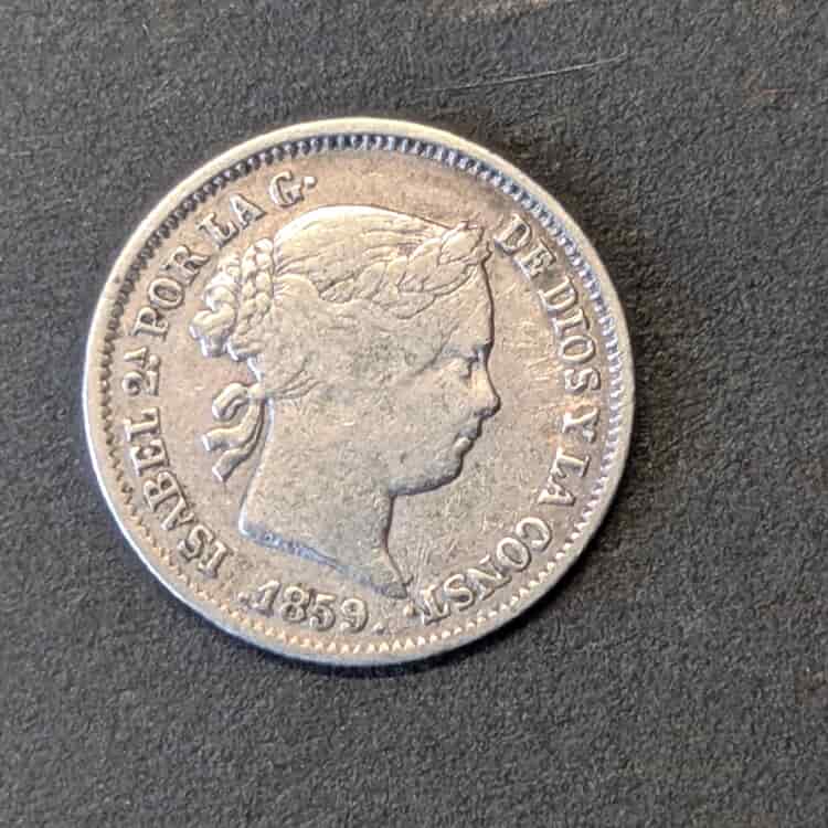 Anverso: Busto de Isabel II a derecha coronada de laurel. Leyenda «ISABEL 2ª POR LA G. DE DIOS Y LA CONST· 1859».