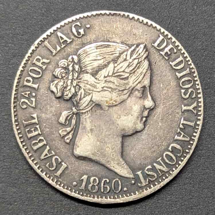 Anverso: Retrato laureado de la reina Isabel II mirando a la derecha. La pátina oscura en los campos hace resaltar el perfil de la reina y los detalles de la corona de laurel, creando un efecto de relieve muy atractivo. Leyenda: «ISABEL 2ª POR LA G· DE DIOS Y LA CONST· 1860».