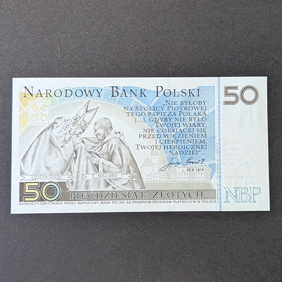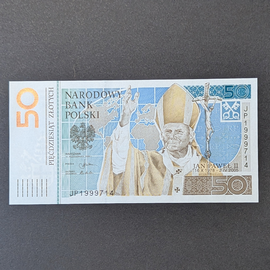 Atesora un fragmento de la historia religiosa y política del siglo XX. Emitido el 16 de octubre de 2006, coincidiendo con el 28º aniversario de la elección de Karol Wojtyła como Papa, este billete marcó un antes y un después al ser el primer billete de colección jamás emitido por Polonia.