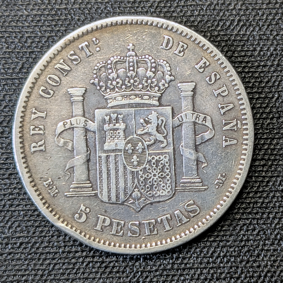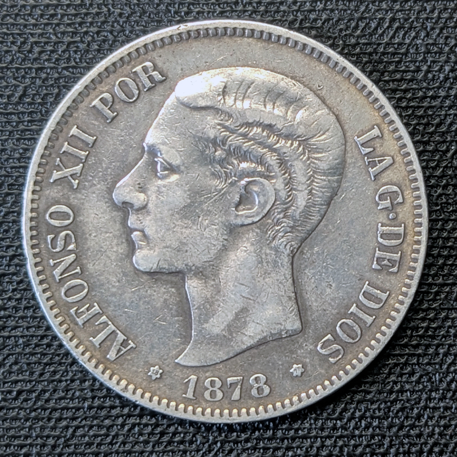 Moneda de 5 Pesetas de 1878, acuñada en Madrid. Representa la consolidación del reinado de Alfonso XII con el busto joven.