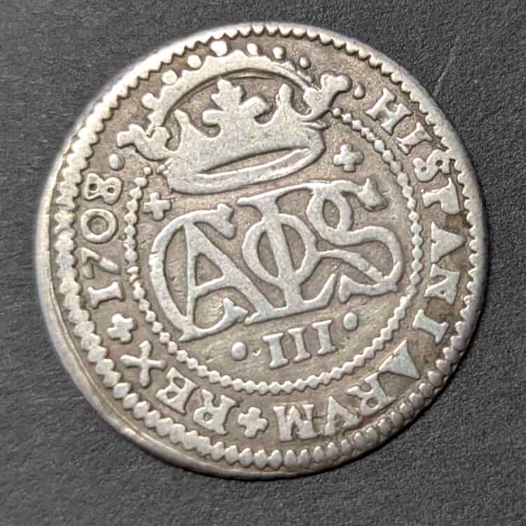 Reverso: El icónico monograma CAROLVS coronado, con el numeral III debajo. La leyenda «HISPANIARUM REX 1708» es completa y totalmente legible, algo difícil de encontrar en estas emisiones.