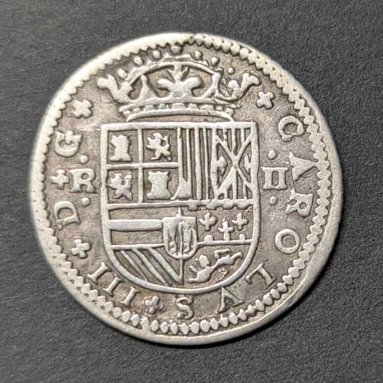 Anverso: Escudo de armas coronado de los Austrias (Castilla y León, Aragón, etc.). A la izquierda la marca de valor R y a la derecha II. Lo más destacable es la nitidez de los castillos y leones, así como la marca bajo el escudo (una S o motivo floral distintivo, generalmente atribuido a la ceca de Barcelona o emisiones locales de Cataluña).