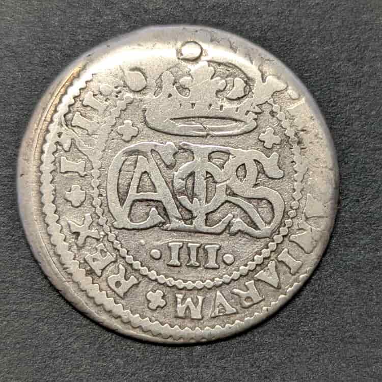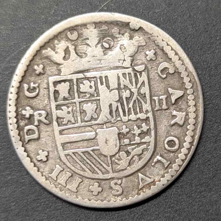 Anverso (Escudo): Muestra el escudo de armas coronado de Castilla y León (simplificado). A la izquierda se aprecia la R (Reales) y el valor II. Debajo del escudo aparece una marca de ceca «S» (un detalle muy curioso, ya que las cecas habituales eran Barcelona «B» o Zaragoza «Z». Podría tratarse de una variante de ensayador o una acuñación local de campaña). Leyenda: «CAROLVS III D G».