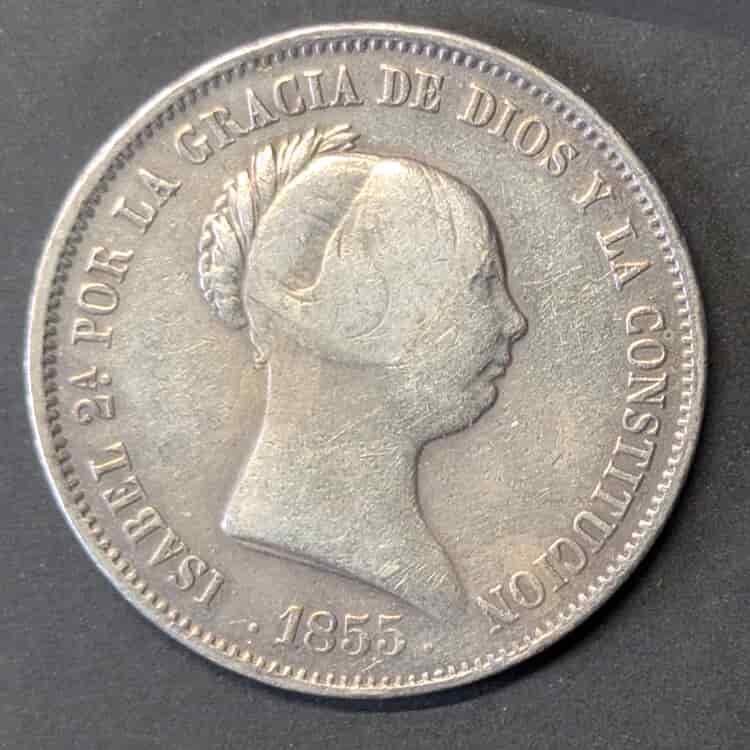 Nota para el coleccionista: Al coleccionar Isabel II, es crucial tener los dos tipos principales de duros: el de cabeza desnuda (como este) y el laureado. Esta pieza de 1855 es el contrapunto perfecto para tu colección de duros del XIX.