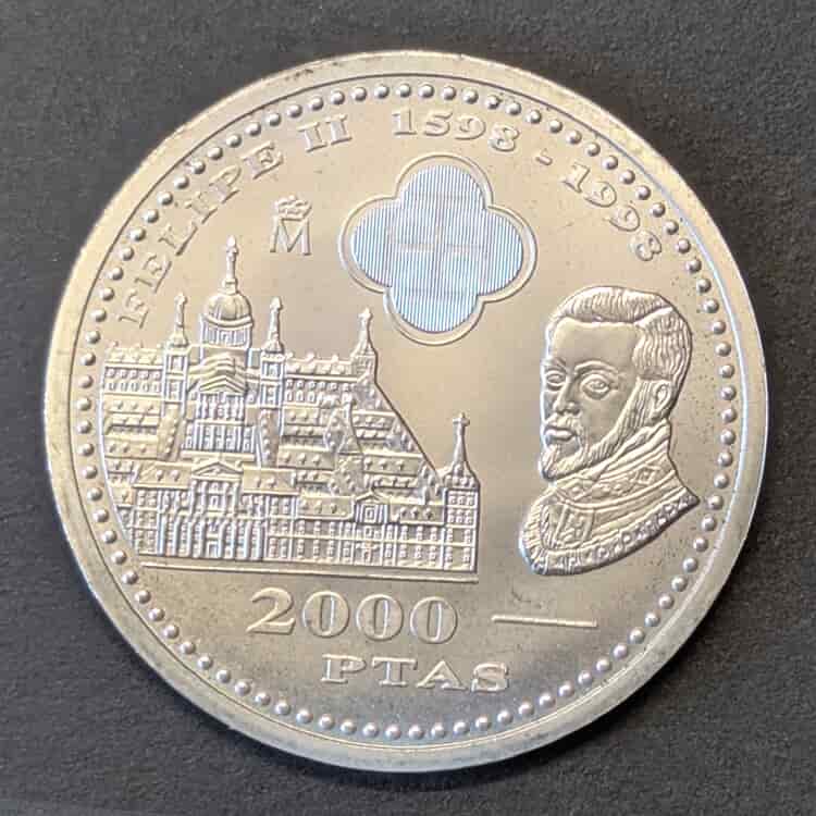 Emitida por la Fábrica Nacional de Moneda y Timbre (FNMT), esta moneda de 2.000 pesetas celebra el cuarto centenario del fallecimiento de Felipe II (1598-1998). Es una pieza que destaca por su diseño detallado y su alto contenido en metal precioso.