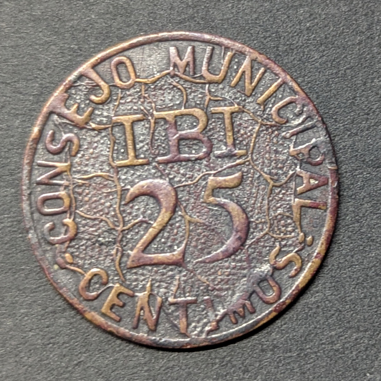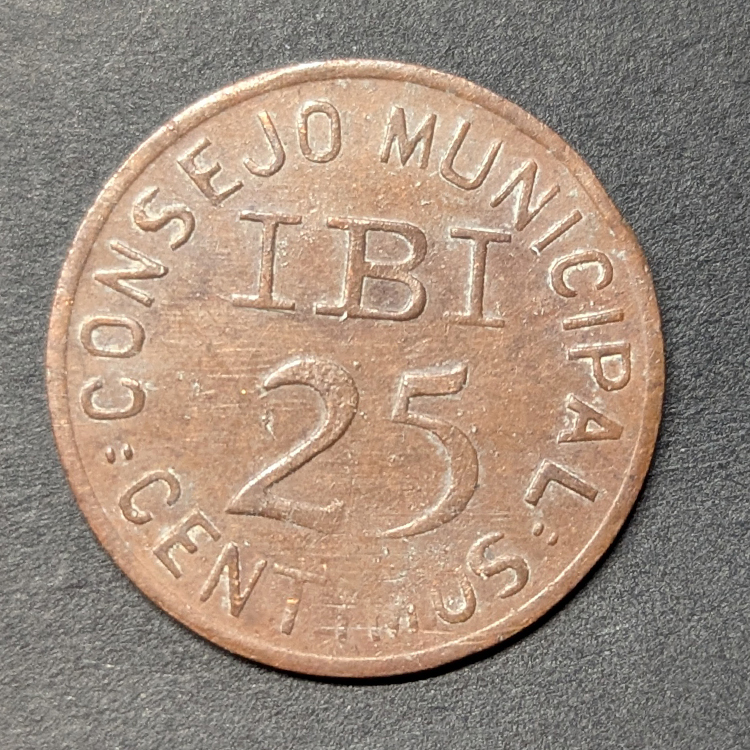 Reverso: Muestra el valor 25 CÉNTIMOS y la leyenda CONSEJO MUNICIPAL IBI. Un detalle curioso de estas emisiones es que existen variantes con un mapa de España de fondo o con fondo liso/texturizado; esta pieza muestra el diseño clásico con un fondo con relieve característico.
