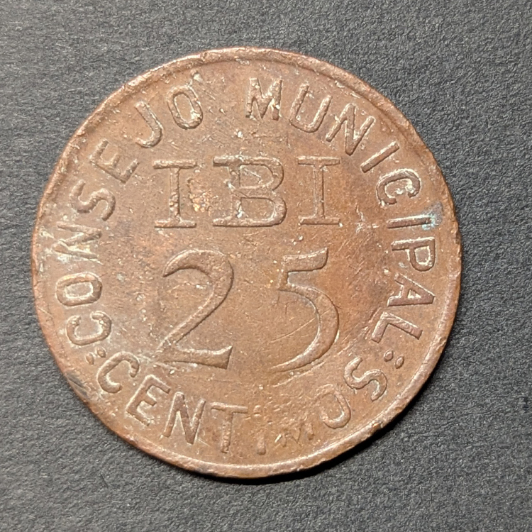 Esta moneda de 25 Céntimos fue emitida por el Consejo Municipal de Ibi para facilitar el cambio pequeño en la localidad alicantina durante la contienda civil. Fue acuñada en cobre (a diferencia de la peseta que suele ser de hierro/acero), aprovechando la maquinaria de la industria juguetera local (Hermanos Payá), lo que le da una calidad de relieve superior a la media de las monedas de necesidad.