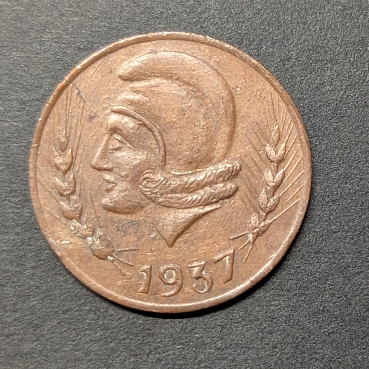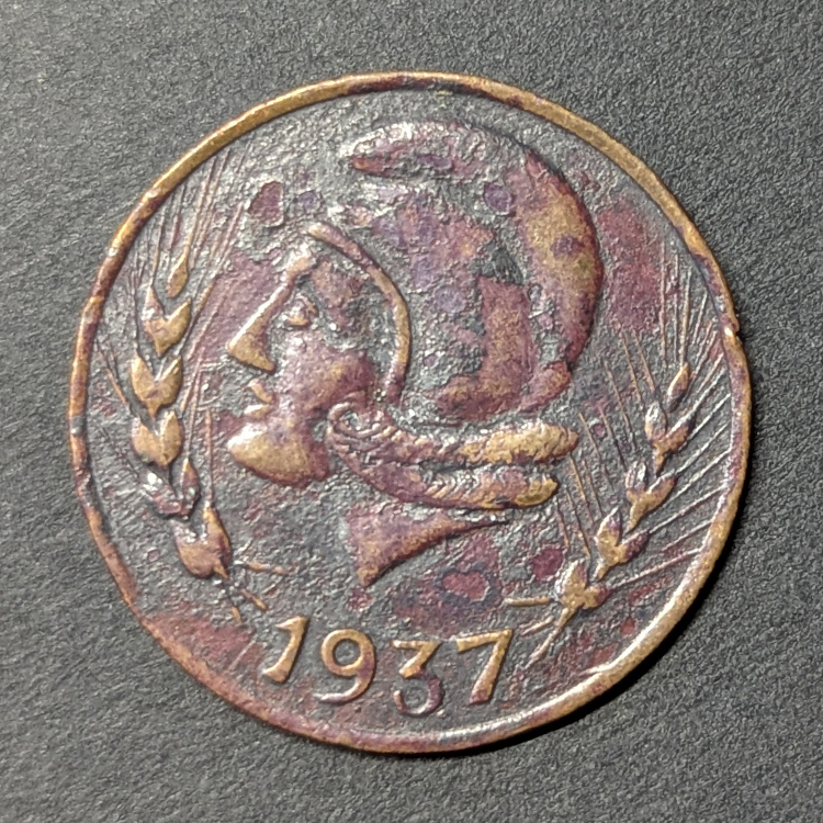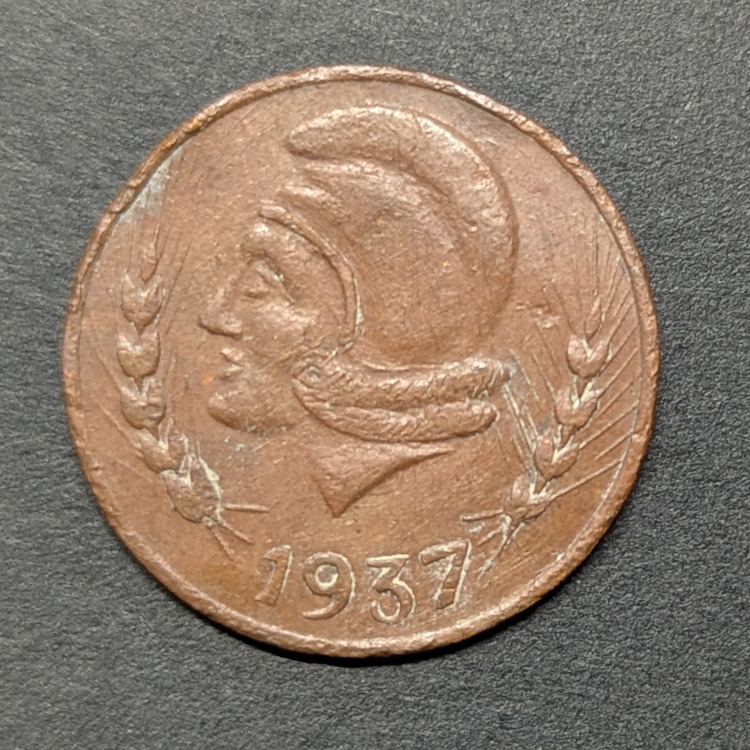 Anverso: Presenta una cabeza alegórica de la República con gorro frigio mirando a la izquierda, flanqueada por dos espigas de trigo, símbolo de la agricultura, y la fecha 1937 en la parte inferior.