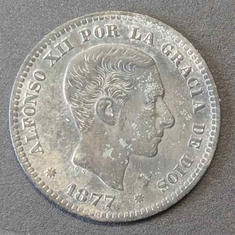 Ponemos a la venta un clásico absoluto de la numismática española: los 5 Céntimos de Alfonso XII, fechados en 1877. Esta es la moneda que el pueblo bautizó cariñosamente como la «perra chica» (al confundir el león del reverso con un perro), un nombre que perduró en el vocabulario español durante más de un siglo.