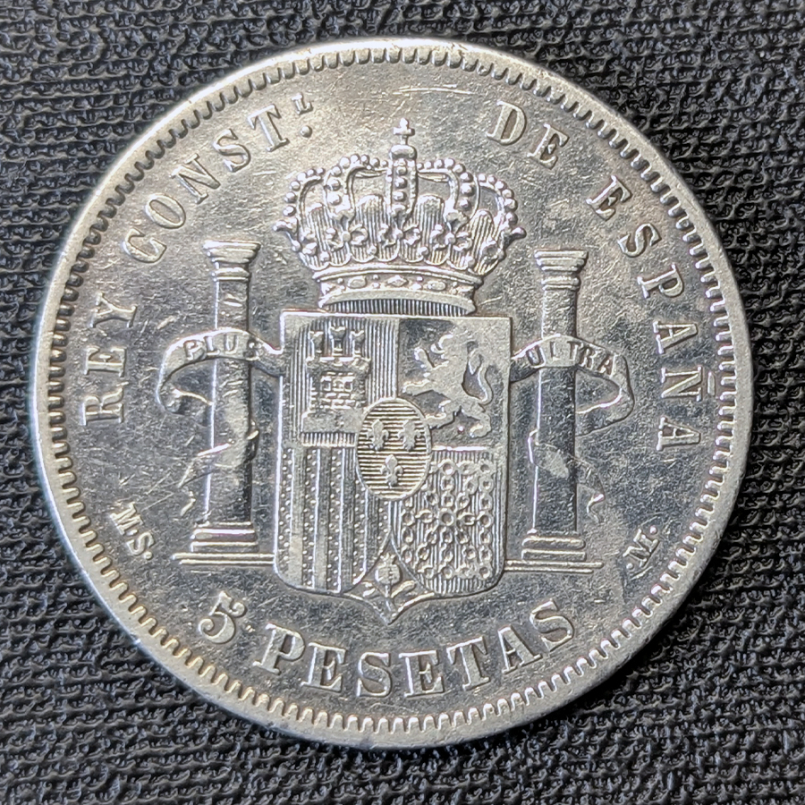 Moneda de 5 Pesetas de 1878, acuñada en Madrid bajo el reinado de Alfonso XII. El anverso muestra el retrato del rey joven (con patillas más cortas que en los modelos posteriores de 1881-1885).