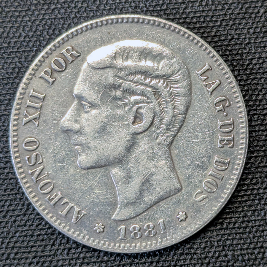 Moneda de 5 Pesetas de 1881, acuñada en Madrid bajo el reinado de Alfonso XII. El anverso presenta el perfil maduro del monarca con patillas, mirando a la izquierda, rodeado por la leyenda «POR LA G. DE DIOS».