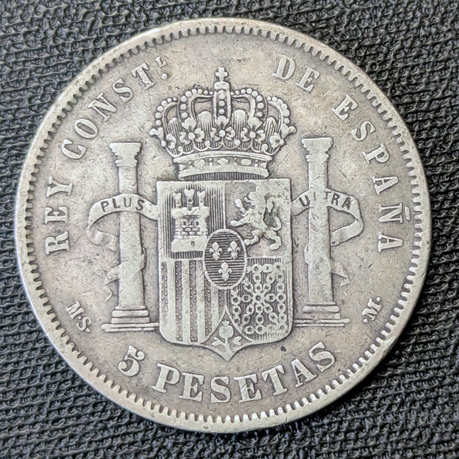 Alfonso XII murió muy joven, en 1885, por lo que estas monedas de sus últimos años (como esta de 1883) marcan el final de una era de estabilidad antes de la regencia de María Cristina. Aunque es una fecha común, tener un duro de «las patillas» es imprescindible para entender la cronología de la peseta.