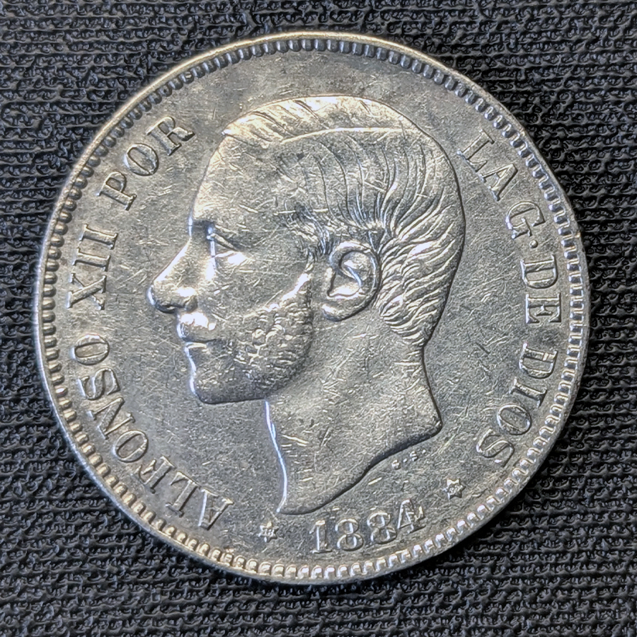 Moneda de 5 Pesetas de 1884, acuñada en Madrid bajo el reinado de Alfonso XII. Presenta el retrato de madurez del rey con sus características patillas. Es una de las fechas clásicas de la restauración, con una acuñación masiva que permitió que llegaran ejemplares hasta hoy, aunque muy pocos en este estado.