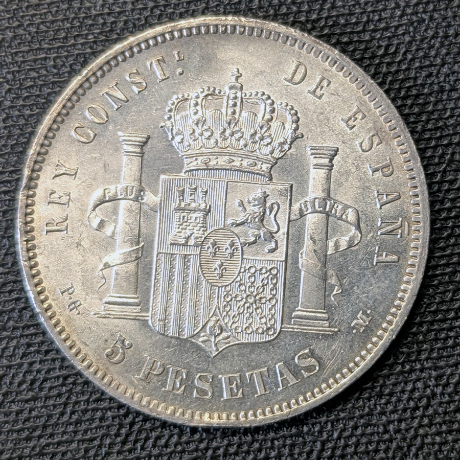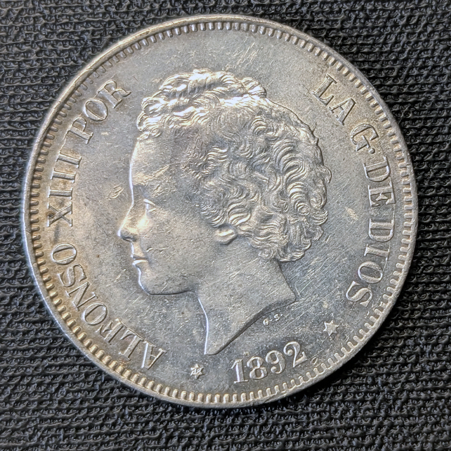 Moneda de 5 Pesetas de 1892, acuñada en Madrid. Este ejemplar es numismáticamente relevante por ser el primer año de emisión del nuevo retrato de Alfonso XIII, conocido como «El Tupé» o «Busto de los Bucles», grabado por Bartolomé Maura. Sustituyó al diseño infantil («Pelón») que se había usado hasta entonces.