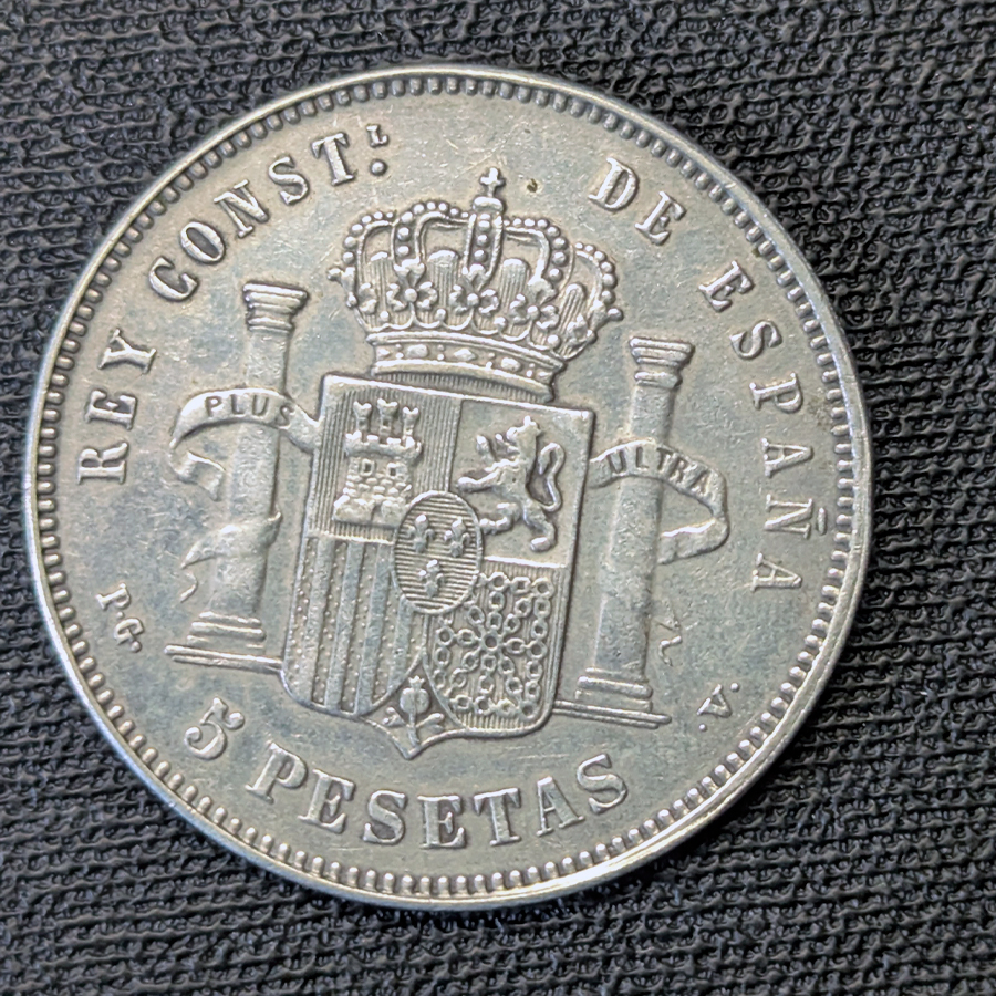 Moneda de 5 Pesetas de 1893, acuñada en Madrid. Representa la etapa intermedia del reinado de Alfonso XIII, mostrando el segundo tipo de retrato conocido como «El Tupé» o «Bucles», grabado por Bartolomé Maura. Este diseño muestra a un rey ya no tan niño, con un peinado característico que le da nombre.