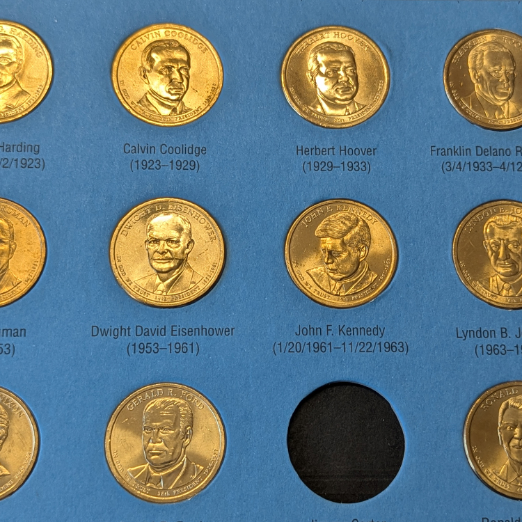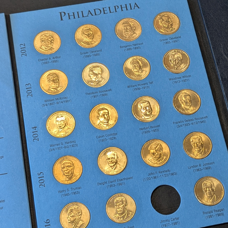 ¿Te has fijado en el llamativo hueco vacío correspondiente a Jimmy Carter? No es un error ni una moneda perdida. La ley estadounidense que autorizó esta serie estipula que, para aparecer en una moneda, un presidente debe llevar fallecido al menos dos años antes del momento de la acuñación. Al ser Jimmy Carter un expresidente aún vivo durante la emisión de la serie (y en la actualidad), el álbum contempla su espacio histórico, pero la Casa de la Moneda nunca llegó a acuñar su dólar. ¡Un detalle histórico fascinante para contar a cualquier aficionado!