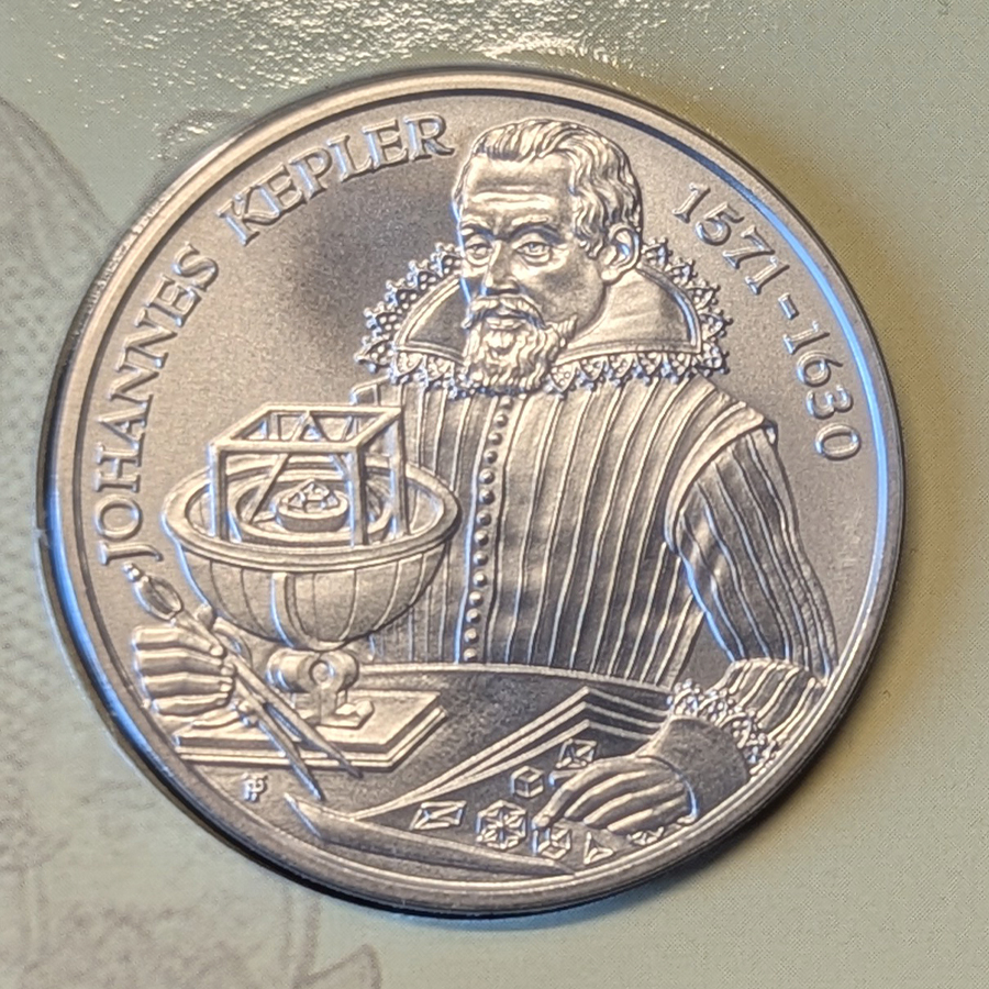 Reverso: Rinde homenaje al genio científico Johannes Kepler, quien impartió clases en Graz y fue amigo del constructor del castillo. El grabado muestra un retrato de Kepler junto a un modelo de su obra Mysterium Cosmographicum y herramientas de dibujo.