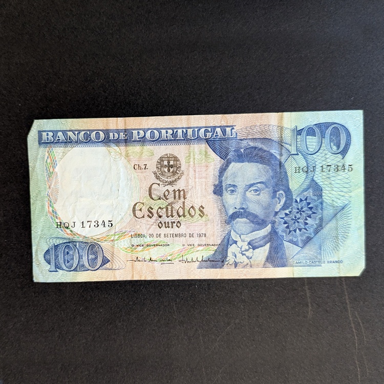 Clásico billete de 100 Escudos del Banco de Portugal, emitido en 1978. Un homenaje al célebre escritor Camilo Castelo Branco con un diseño en tonos azules y ocres.