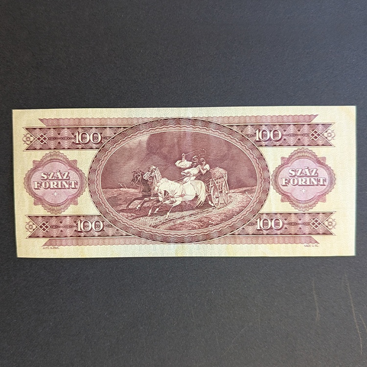La obra pictórica del reverso fue tan aclamada que convirtió a este billete en uno de los más queridos por el pueblo húngaro, permaneciendo en sus carteras durante décadas. Conseguir billetes de la Europa comunista es relativamente fácil, pero conseguirlos en este altísimo grado de conservación es un premio mayor: ¡la inmensa mayoría acabaron destrozados, ajados o manchados debido a la fortísima inflación que sufrió el país a finales de los años 80, que obligaba a la gente a llevar fajos enteros de estos billetes para comprar bienes básicos!