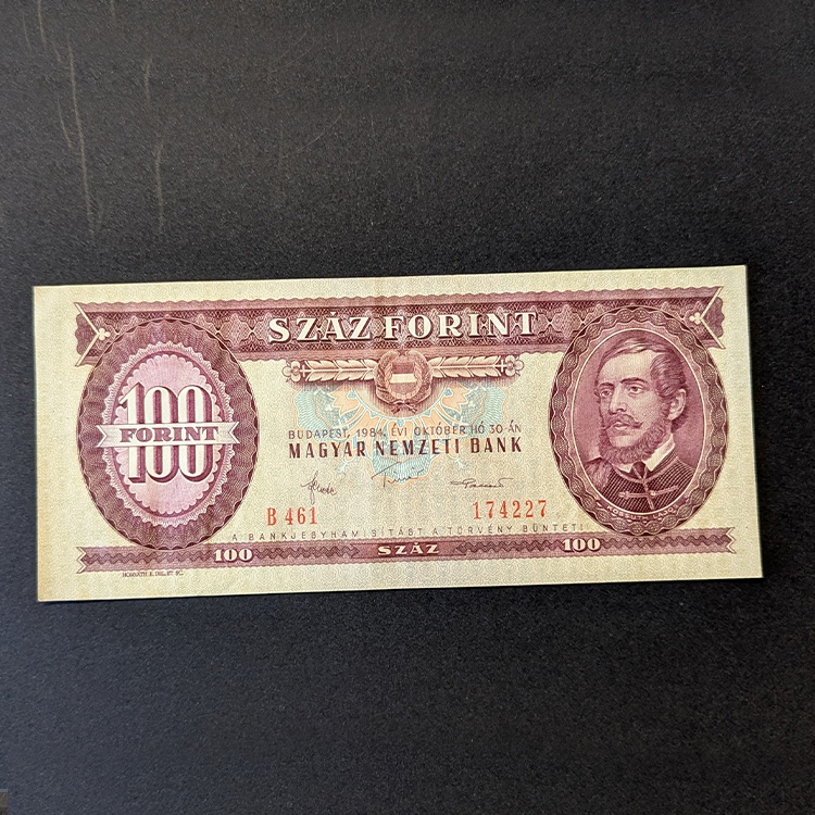 Este magnífico billete de 100 forintos (Száz Forint) es uno de los máximos exponentes del arte notafílico de la Europa del Este durante la etapa socialista. Emitido a finales de 1984 por el Magyar Nemzeti Bank, este ejemplar destaca especialmente por su gran formato y por la viveza de sus tonos rojizos y púrpuras, que se aprecian a la perfección gracias a su soberbio estado de conservación.