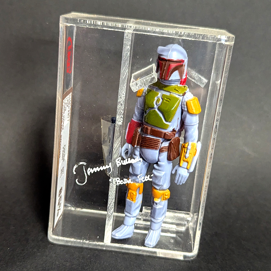 La Firma de Jeremy Bulloch: El estuche de acrílico protector lleva la firma autógrafa en rotulador blanco de Jeremy Bulloch (fallecido en 2020), quien interpretó al personaje en la Trilogía Original. Al estar firmada sobre el estuche y no sobre la figura, se preserva la integridad del juguete vintage mientras se añade el valor histórico del autógrafo.