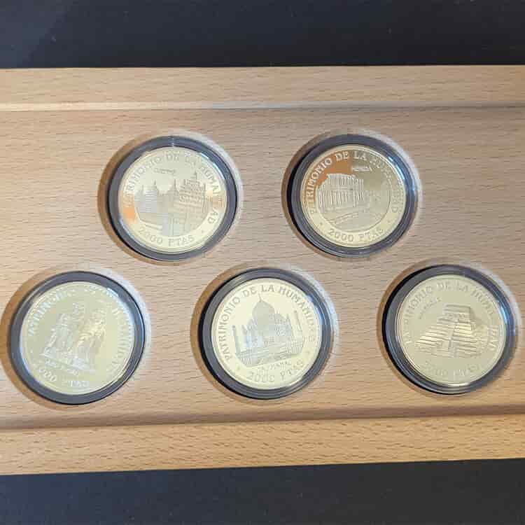 ¡Una espectacular colección de monedas que hay que tener! Presentamos la exquisita Primera Serie de la colección «Patrimonio de la Humanidad», acuñada por la Fábrica Nacional de Moneda y Timbre en 1996. Un viaje numismático por cinco de las maravillas arquitectónicas más impresionantes del planeta, materializado en cinco hermosas monedas de plata de ley. Presentada en su elegante estuche de madera, es sin duda una gran inversión y una pieza central indiscutible para cualquier escaparate numismático.