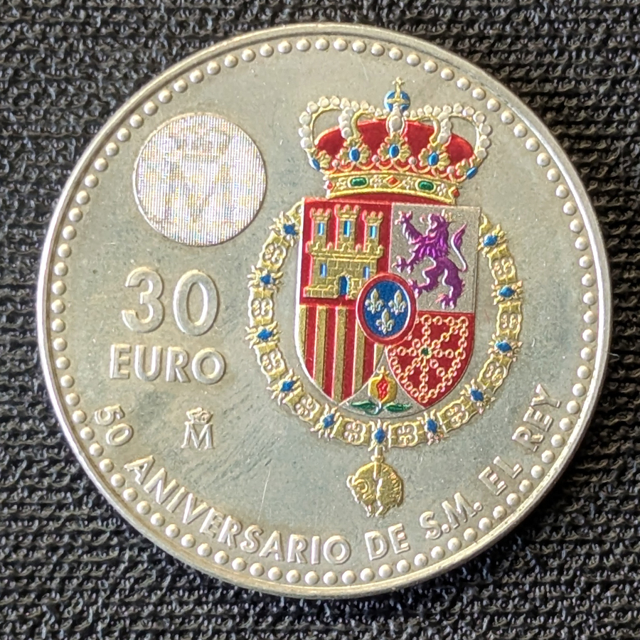 Reverso: Aquí reside la verdadera joya de esta moneda. En el centro, destaca el Escudo de Armas del Rey, reproducido con un exquisito esmaltado a color que resalta los cuarteles de Castilla, León, Aragón y Navarra, así como el escusón de los Borbón-Anjou. El escudo está rodeado por el collar del Toisón de Oro. A la izquierda, se aprecia el valor facial «30 EURO» y, sobre este, una imagen latente de seguridad (cuádruple imagen) que alterna entre el número 50, la M coronada, una estrella y la flor de lis. En la parte inferior, la leyenda conmemorativa: «50 ANIVERSARIO DE S.M. EL REY».