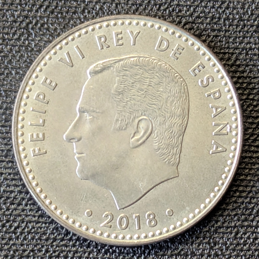 Anverso: Muestra la efigie de perfil de S.M. el Rey Felipe VI mirando a la izquierda. Rodeando el retrato, la leyenda «FELIPE VI REY DE ESPAÑA» y en la parte inferior, el año de acuñación «2018», flanqueado por dos puntos. El diseño mantiene la elegancia sobria característica de las emisiones reales.