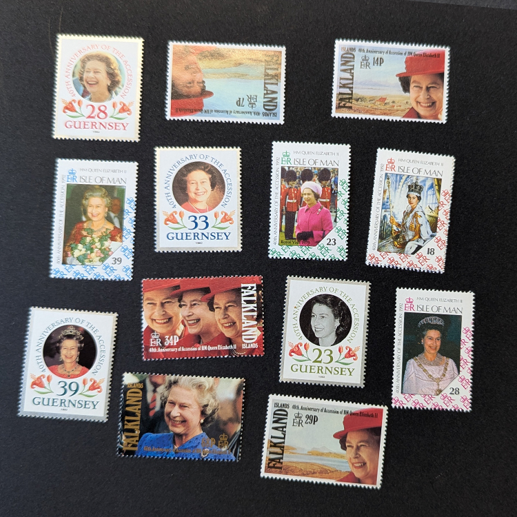 Cuatro décadas de reinado en imágenes. Este colorido lote de 1992 celebra el «Jubileo de Rubí» de la Reina Isabel II. Un recorrido fotográfico por la vida de la monarca a través de las emisiones de la Isla de Man, Guernsey y las Islas Malvinas.