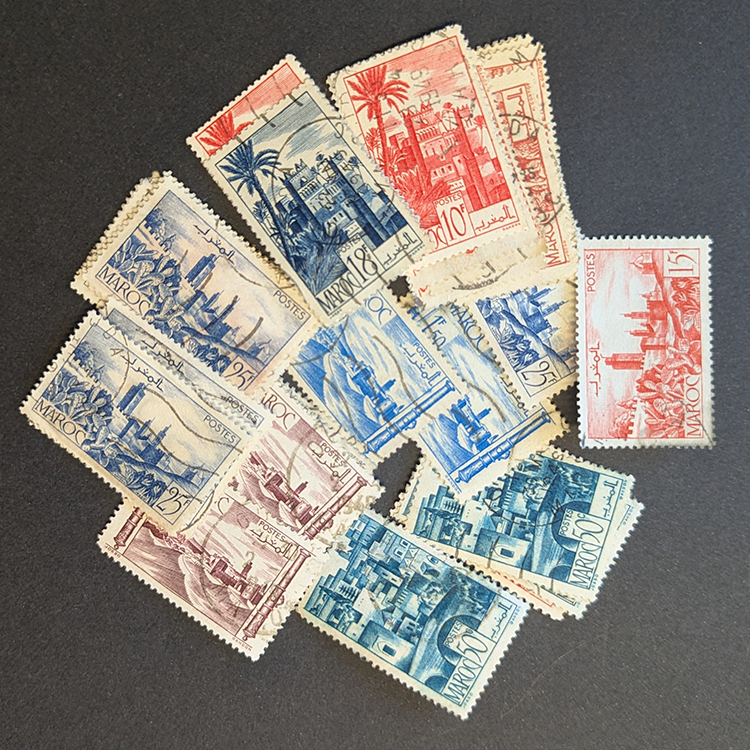 Estos sellos pertenecen a las emisiones definitivas del Protectorado Francés en Marruecos, circulados mayoritariamente en la década de 1940 y 1950 (se aprecian matasellos fechados en 1949). Conocidos como series de «Sitios y Monumentos», fueron diseñados para mostrar al mundo la belleza monumental del reino jerifiano. A diferencia de las colonias británicas que siempre ponían al rey, Francia prefería mostrar la cultura local en sus colonias. El lote incluye varios valores icónicos:
