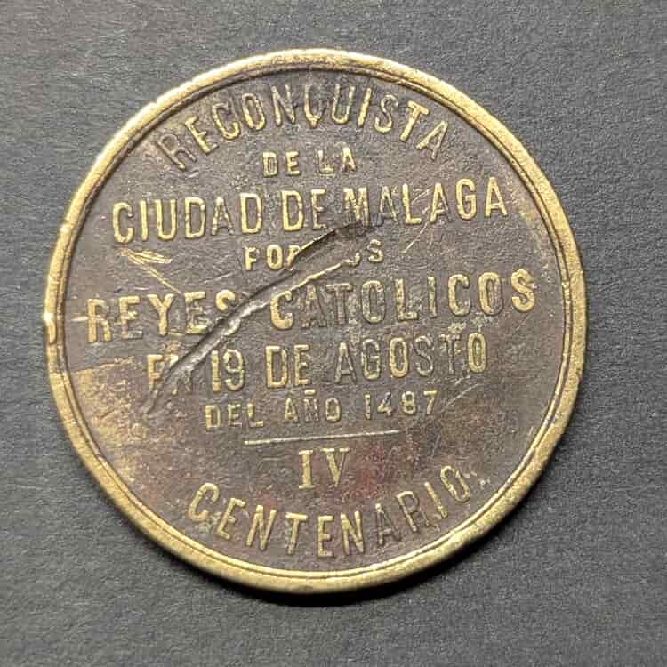 El reverso funciona como un documento histórico en sí mismo, detallando la efeméride: «Reconquista de la ciudad de Málaga por los Reyes Católicos en 19 de agosto del año 1487 – IV Centenario».