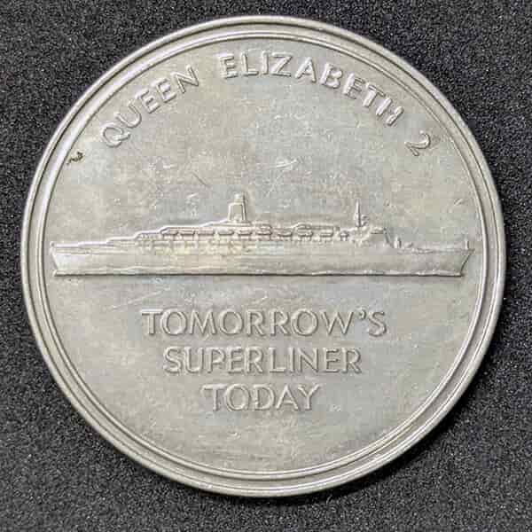 Anverso: Presenta el perfil detallado del majestuoso buque de pasajeros navegando. Le acompaña la leyenda superior «QUEEN ELIZABETH 2» y el histórico eslogan publicitario en el exergo: «TOMORROW’S SUPERLINER TODAY» (El supertransatlántico del mañana, hoy).