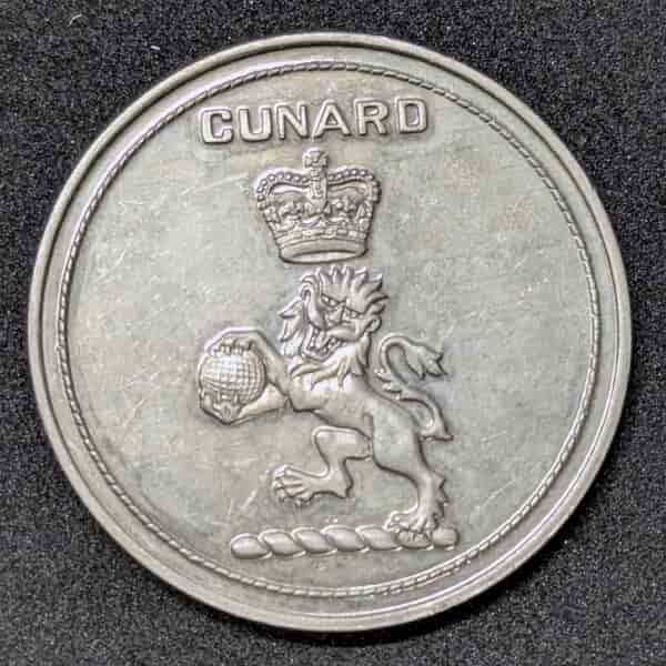 Reverso: Muestra la palabra «CUNARD» coronando el icónico emblema de la compañía naviera británica: un león rampante coronado que sostiene un globo terráqueo, símbolo de su histórico dominio en las rutas oceánicas mundiales.