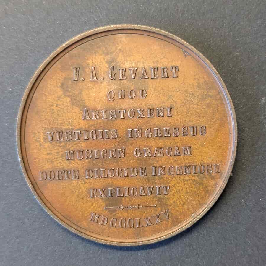 Reverso: Inscripción completa en latín dedicada a F. A. GEVAERT, alabando su trabajo sobre Aristóxeno (filósofo griego de la música): «QUOD ARISTOXENI VESTIGIIS INGRESSUS MUSICEN GRAECAM DOCTE DILUCIDE INGENIOSE EXPLICAVIT» (Porque siguiendo los pasos de Aristóxeno, explicó la música griega docta, lúcida e ingeniosamente).
