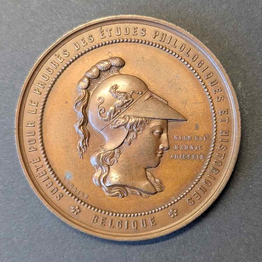 Medalla belga acuñada en 1871 por la «Sociedad para el Progreso de Estudios Filológicos e Históricos». Rinde homenaje a François-Auguste Gevaert por su obra sobre la música de la Antigua Grecia. Anverso con busto de Minerva y lema filosófico en griego.