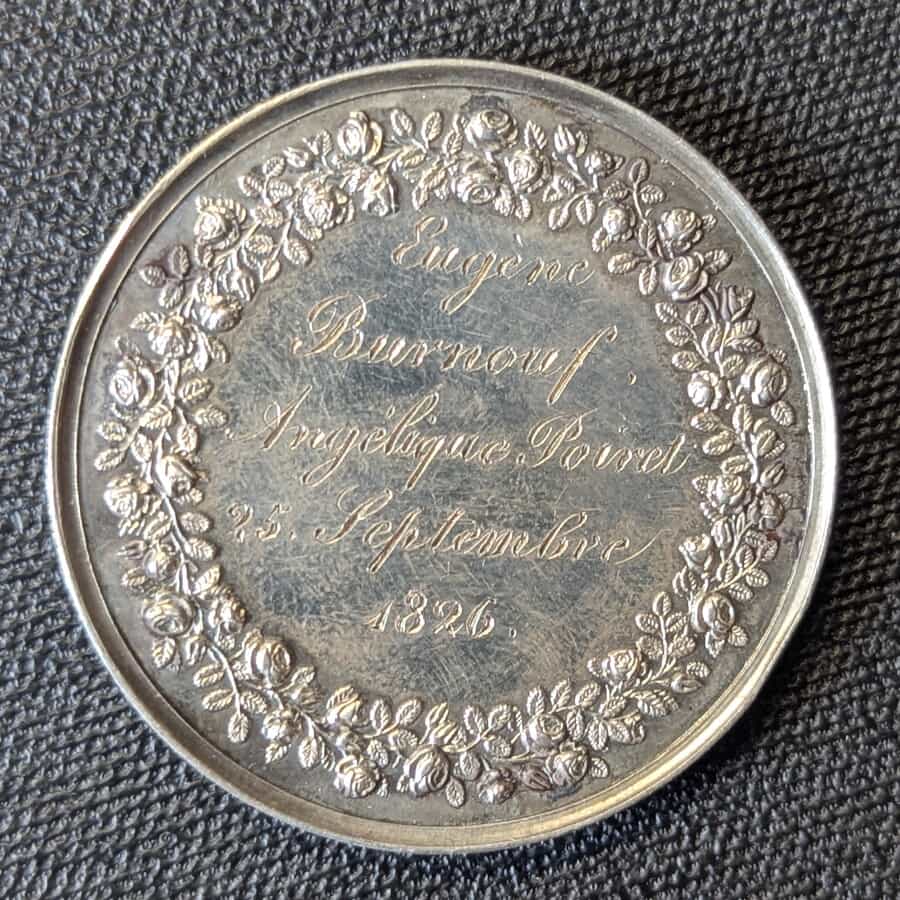Esta medalla es un documento histórico en plata. Conmemora el matrimonio celebrado el 25 de septiembre de 1826 entre Eugène Burnouf (1801-1852) y Angélique Poiret.