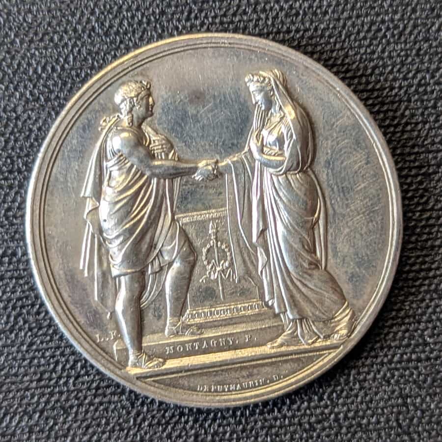 Medalla de plata maciza personalizada, acuñada para celebrar el enlace entre el ilustre indólogo Eugène Burnouf y Angélique Poiret en 1826. Obra del grabador Jean-Pierre Montagny bajo la dirección del Barón de Puymaurin. Una pieza de museo con procedencia histórica directa.