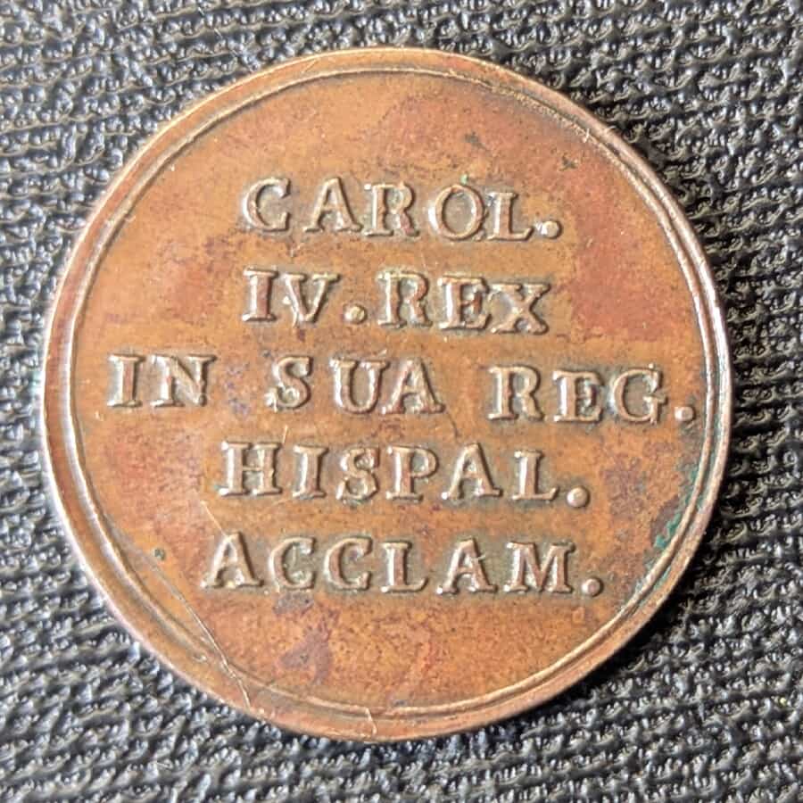 Anverso: Muestra la leyenda latina «CAROL. IV. REX IN SUA REG. HISPAL. ACCLAM.» (Carlos IV, Rey aclamado en su Real Sevilla), centrada en el campo, sin retrato, al estilo de las antiguas fichas universitarias.