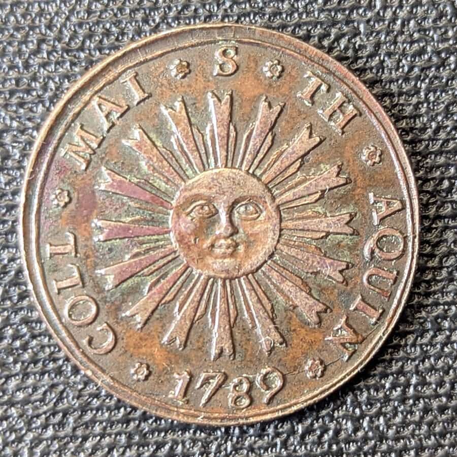 Reverso: Presenta un diseño espectacular y esotérico: un Sol Humanizado radiante (símbolo de la sabiduría de Santo Tomás de Aquino). Rodeado por la inscripción del emisor: «COLL. S. TH. MAI. AQUIN.» (Colegio Mayor de Santo Tomás de Aquino) y la fecha histórica 1789.