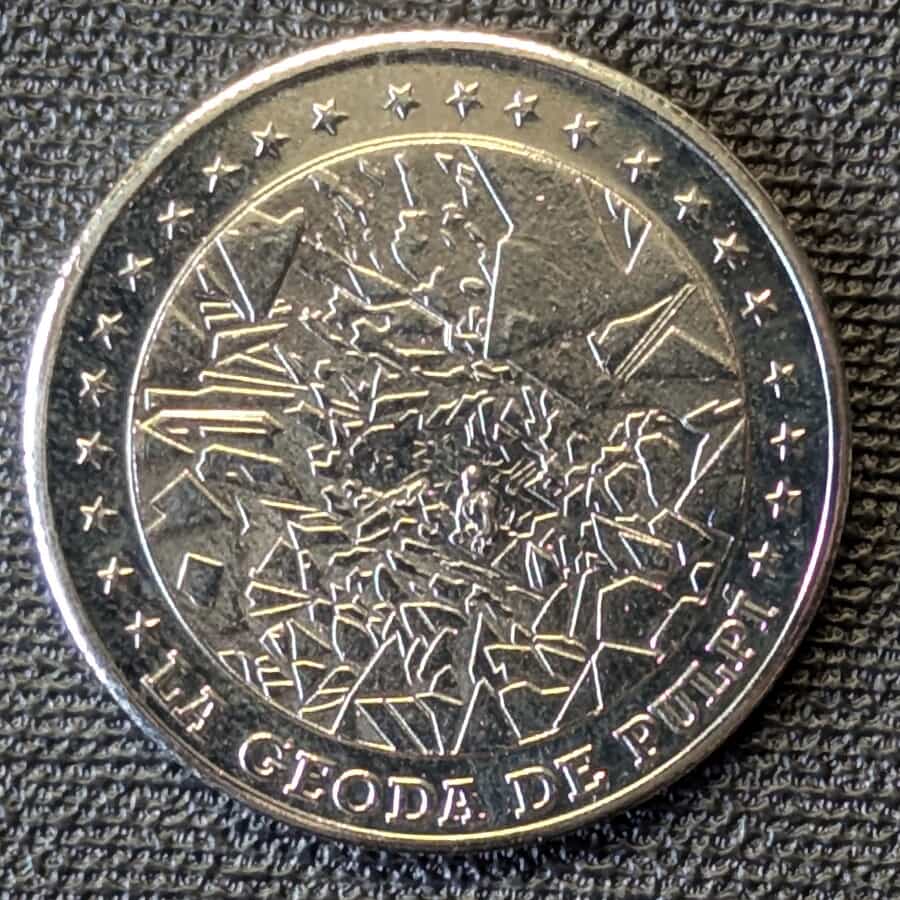 El anverso presenta una representación estilizada de los famosos cristales de yeso gigantes que han hecho mundialmente famosa a esta cueva, rodeada de estrellas que evocan su importancia como patrimonio natural europeo. El reverso muestra el logotipo oficial «La Geoda de Pulpí» sobre un fondo geométrico que simula las facetas de los cristales.
