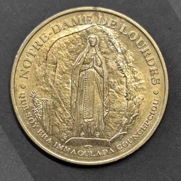 Anverso: Muestra la imagen icónica de la Virgen María apareciéndose en la gruta de Massabielle. Rodeándola, la inscripción francesa «NOTRE-DAME DE LOURDES» y, a sus pies, la famosa frase en dialecto gascón (occitano) que la aparición dijo a Santa Bernadette: «QUÈ SOY ERA IMMACULADA COUNCEPCIOU» (Yo soy la Inmaculada Concepción).