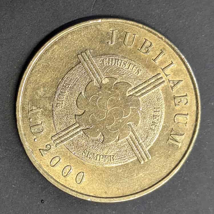 Reverso: Presenta el logotipo oficial del Gran Jubileo del año 2000: cinco palomas que forman un globo terráqueo y una cruz, diseñado por Emanuela Rocchi. Alrededor, el lema en latín inspirado en la carta a los Hebreos: «CHRISTUS HERI HODIE SEMPER» (Cristo ayer, hoy y siempre) y la fecha JUBILAEUM A.D. 2000.