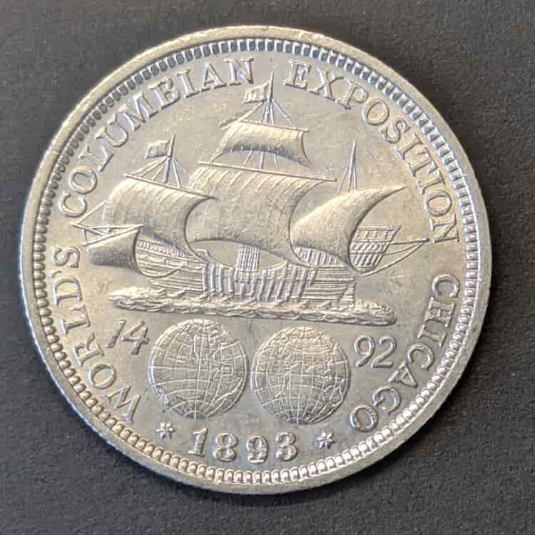 • Reverso: Muestra la nave capitana, la Santa María, navegando sobre dos hemisferios (el Viejo y el Nuevo Mundo) que flanquean la fecha 1492. Debajo, la fecha de acuñación 1893. Un diseño náutico espectacular obra de George T. Morgan (el mismo creador del famoso «Morgan Dollar»).