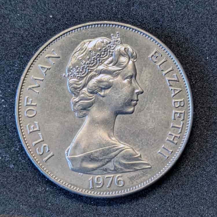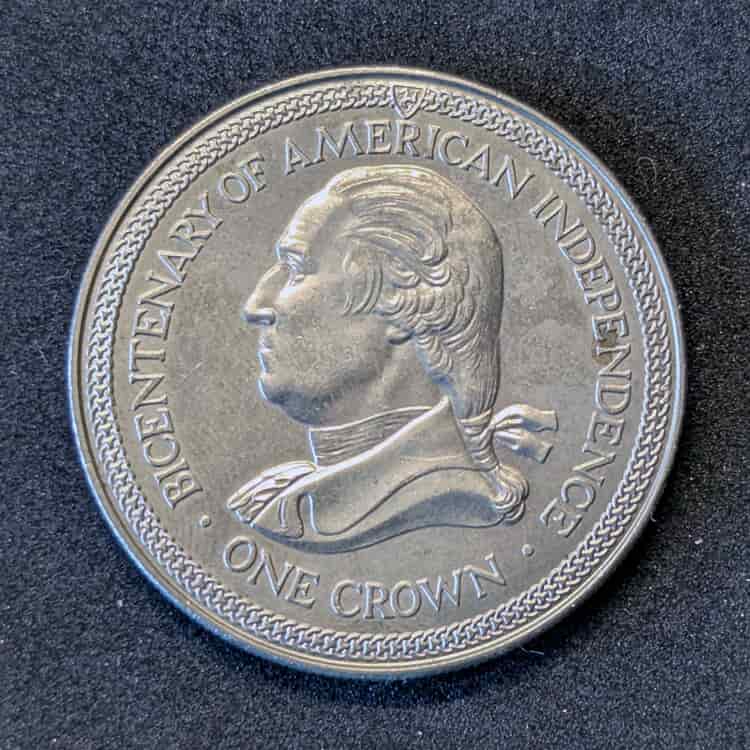 En 1976, el mundo entero celebró el Bicentenario de la Declaración de Independencia de los Estados Unidos. La Isla de Man, haciendo gala de su característica independencia numismática, se unió a las festividades internacionales emitiendo esta contundente y hermosa moneda con el tamaño tradicional de las históricas «Coronas» británicas.